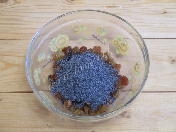 Пока тесто поднимается, займитесь начинкой. Распарьте изюм и прямо к горячему добавьте мак.