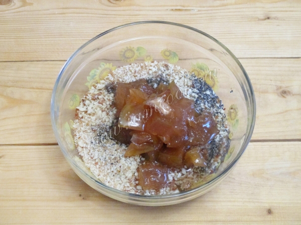 Перемешайте эту начинку из мака, орехов и изюма с яблоками свежими или из варенья.