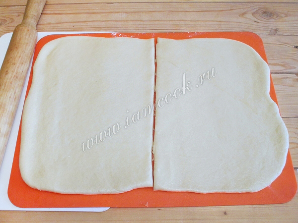 Разделите тесто на две части сразу и раскатайте их или раскатайте тесто в один пласт и потом разрежьте на две части.