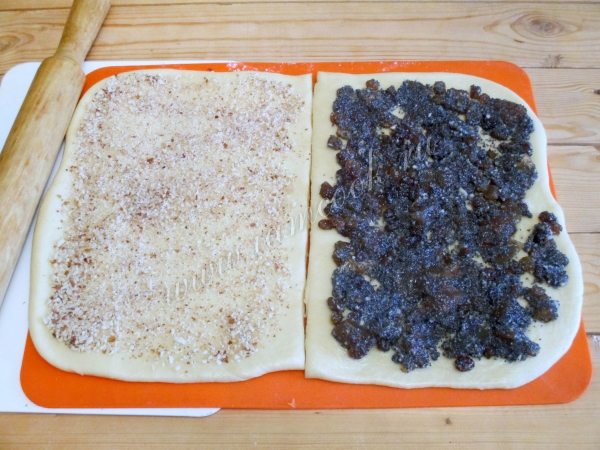 Одну половину теста посыпьте ореховой начинкой, а на вторую часть нанесите вторую начинку из мака, изюма орехов и яблок.