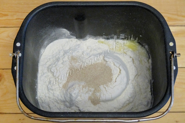 В чашу хлебопечки влейте массу из молока и яйца, добавьте масло, затем муку, сахар и дрожжи.