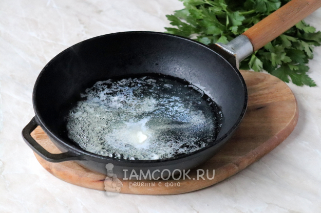 Тем временем кусочек сливочного масла растопим на сковороде и выльем яйца.