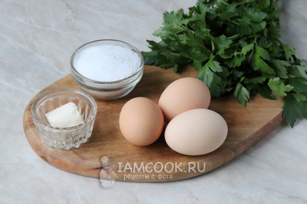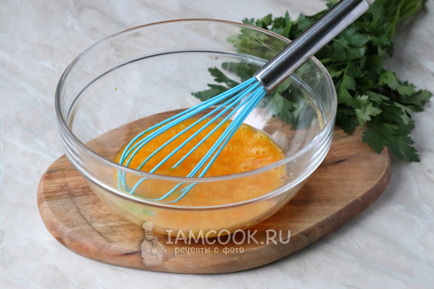 Куриные яйца вобьем в глубокую миску, добавим щепотку соли и перемешаем с помощью венчика. Взбивать до пены не нужно, достаточно разрушить структуру яиц. На данном этапе к яичной смеси можно добавить немного молока - в некоторых источниках встречаются такие варианты (я этого не делала).