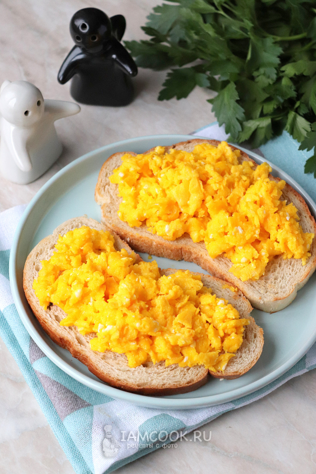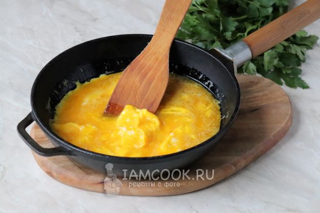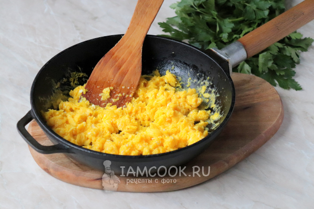 В отличие от омлета, не нужно дожидаться, пока появится румяная корочка, нужно яичную массу сразу начинать интенсивно перемешивать.