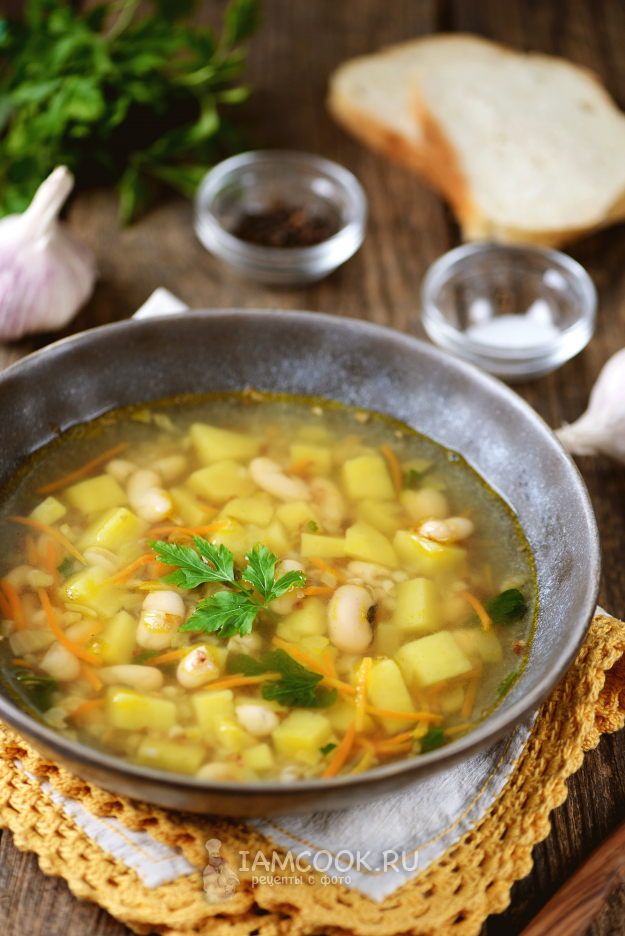 Добавьте консервированную фасоль, долейте воды до верха кастрюли, варите минут 5-7.