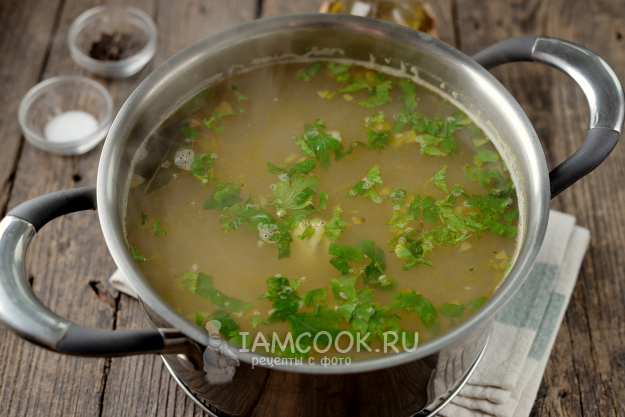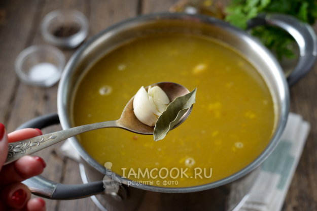 Крупный зубчик чеснока раздавите тыльной стороной ножа, добавьте его вместе с лавровым листом, варите 5 минут. Посолите суп и поперчите по своему вкусу.
