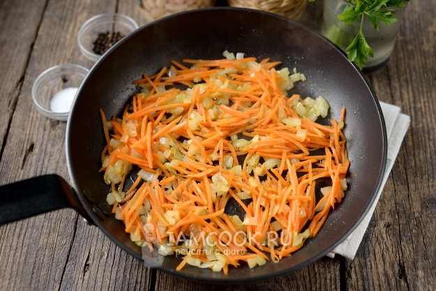 В это время разогрейте в сковороде немного растительного масла, выложите в него нарезанный мелким кубиком репчатый лук и тонко нашинкованную морковь. Обжарьте овощи минут 5 на умеренном огне.