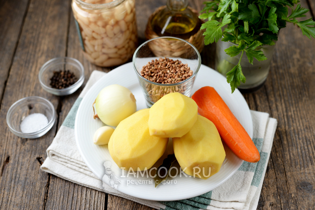 Подготовьте продукты для супа с гречкой и фасолью. Лук, морковь, чеснок и картофель почистите, помойте под проточной водой.