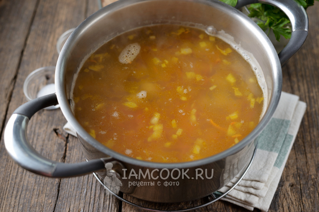 Спустя время переложите овощную зажарку в кастрюлю, доведите до кипения, соберите всю пену с поверхности.