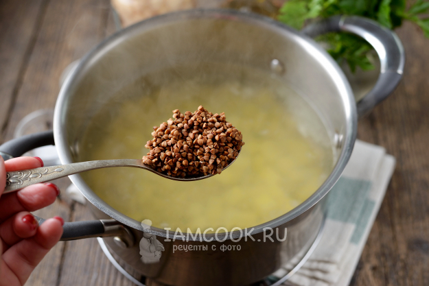 Крупу гречневую промойте до чистой воды, уберите весь мусор, переложите в кастрюлю к картофелю, варите 10 минут. Обязательно соберите всю пену, после добавления гречки ее будет много.