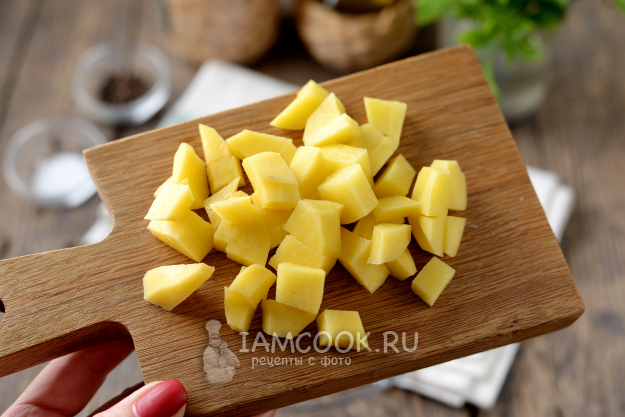 Наберите в кастрюлю чуть больше половины воды, положите картофель, нарезанный мелким кубиком, варите минут 5-7.