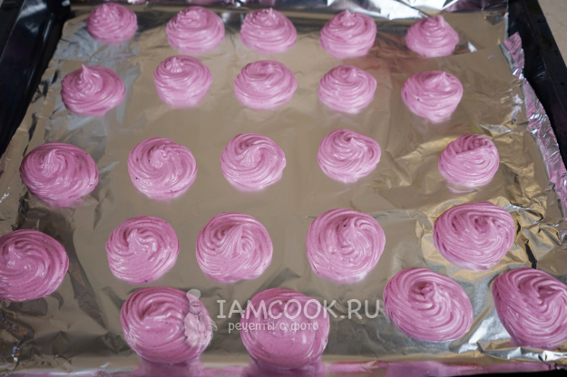 Не прекращая взбивать, тонкой струйкой вводим сироп в зефирную массу. Масса становится более плотной. Взбиваем ещё 3 минуты. В это время подготавливаем кондитерский мешок с вашей любимой насадкой. Противень застилаем пергаментом или фольгой. Перекладываем зефирную массу в мешок и отсаживаем на противень.