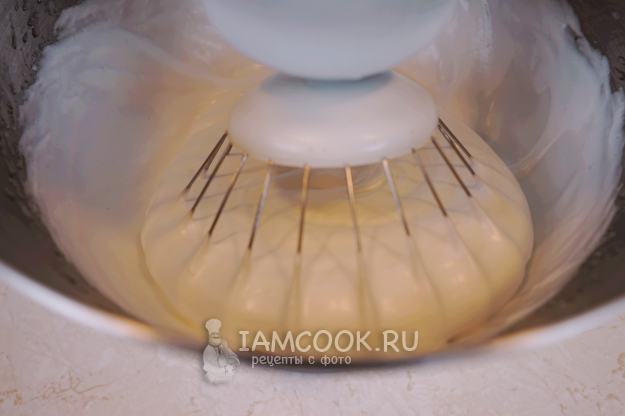 Во взбивающийся рассол постепенно вводим 100 гр. сахара и ванильный сахар (по желанию). Получается пышная плотная масса, которая уже неплохо держит форму.