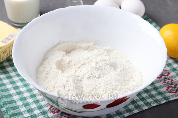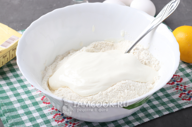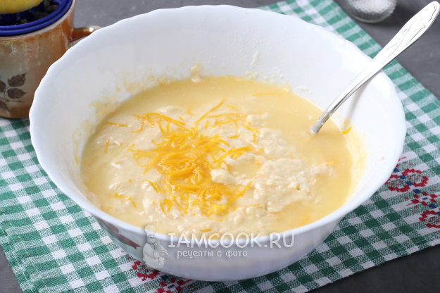 Добавить в тесто цедру и лимонный сок. Если готовите с содой, то на этом этапе её можно добавить в лимонный сок, дождаться реакции и добавить всю смесь в тесто.