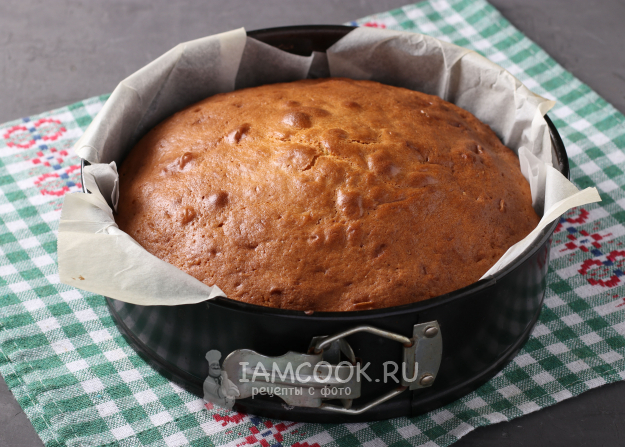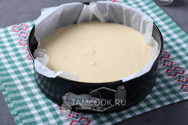 Форму диаметром 22 см застелить пергаментом и влить тесто.