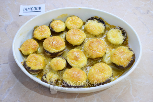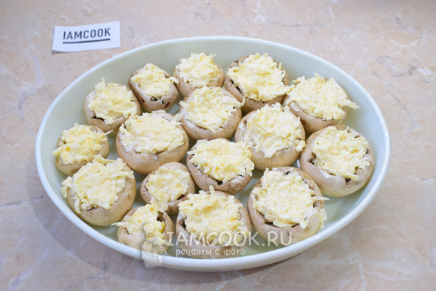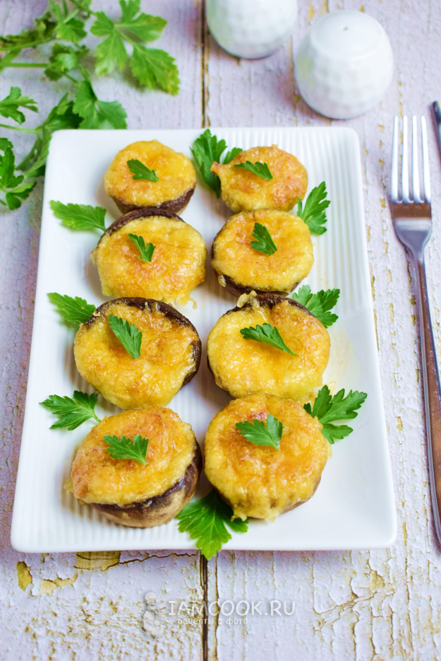При запекании шампиньоны пустят сок, уменьшатся в размере, а сыр расплавится и станет золотистого цвета.