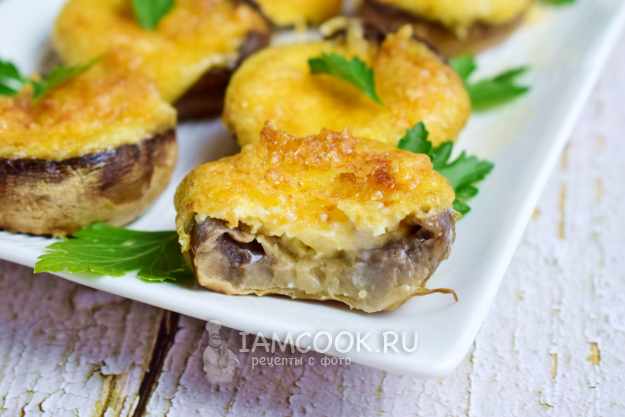 Извлеките готовые шампиньоны с сыром из духовки, переложите на блюдо и подавайте к столу!