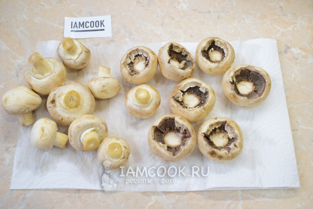 Шампиньоны промойте в проточной воде, а затем обсушите с помощью бумажного полотенца. Если не удалить с них лишнюю влагу, они будут размокать.