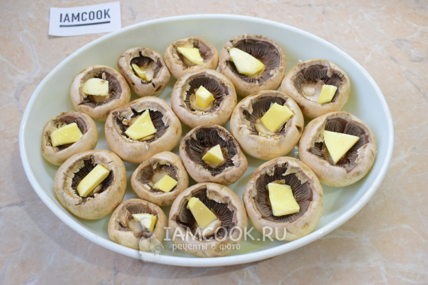 Для запекания подойдёт керамическая форма, но можно взять и любую другую жаропрочную. Смажьте форму сливочным маслом. Уложите в форму шампиньоны и в каждый из них положите маленький кусочек сливочного масла. При запекании оно растает и шампиньоны пропитаются сливочным вкусом.