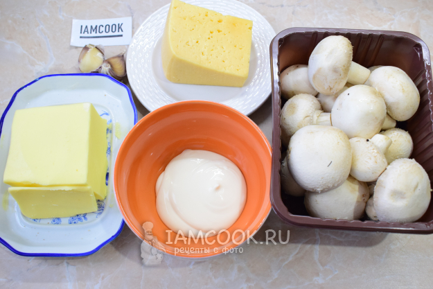 Подготовить все ингредиенты для запекания шампиньонов с сыром в духовке. Шампиньоны выбирайте белые и крупные. Они должны быть без темных пятен и видимых повреждений. Учитывайте, что при запекании они уменьшатся в размере. Сыр можно взять любой по своему вкусу, главное, чтобы его легко можно было натереть на терке.