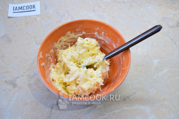 В отдельной чаше приготовьте сырную начинку. Для этого натрите сыр на мелкой терке и соедините его с майонезом и измельченным чесноком. Хорошо все перемешайте.