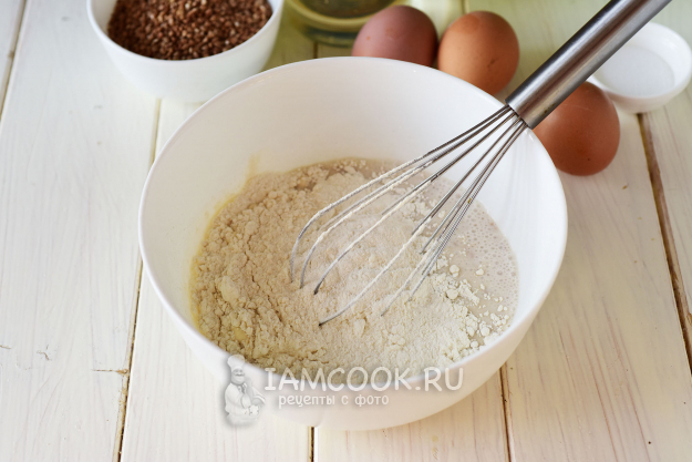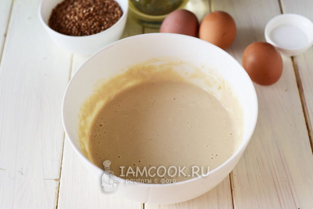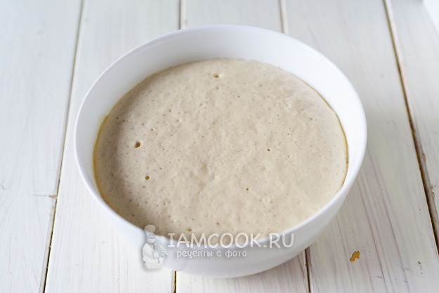 Перемешаем венчиком до получения опары, которая по консистенции похожа на сметану. Миску с опарой оставим в комнатных условиях на 20 минут для созревания.