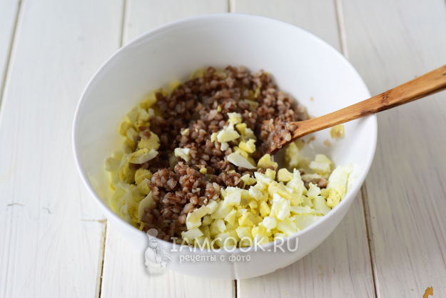 Обжаренный лук и отваренную гречку соединим в отдельной миске, посолим и перемешаем.
