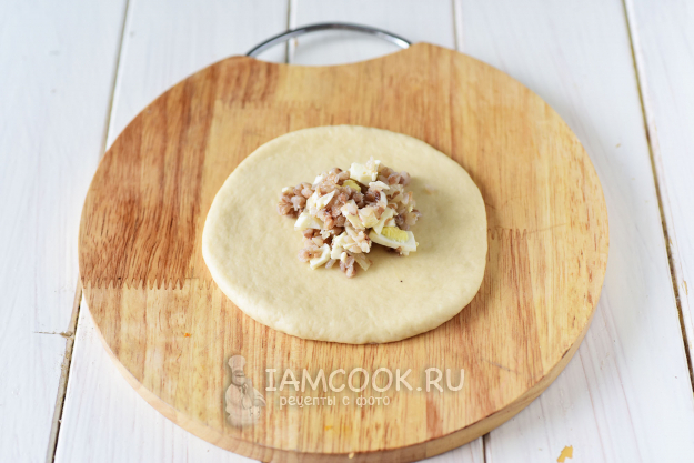 Поднимем края и скрепим их удобным способом, формируя пирожок. Так же поступим со всем оставшимся тестом и гречневой начинкой.