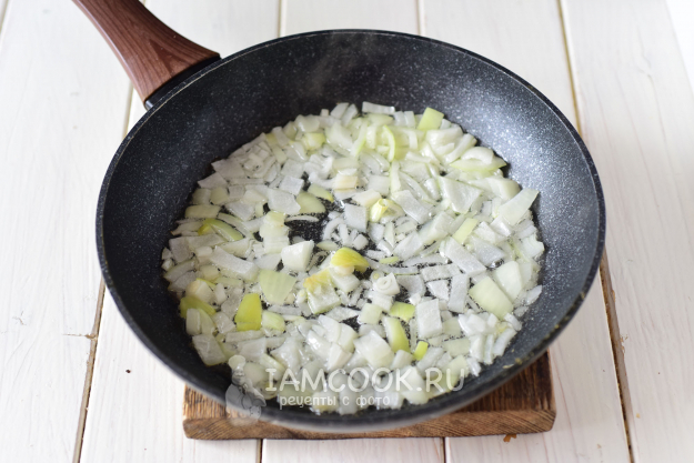 В сковороде разогреем растительное масло и выложим мелко нашинкованный лук, обжарим до мягкости (примерно 10 минут).
