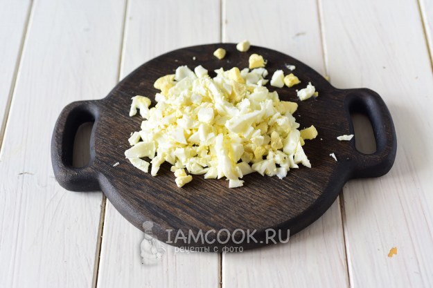Отварные яйца освободим от скорлупы и мелко нашинкуем ножом.