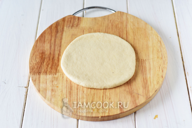 От теста отделим часть весом в 80-85 г, раскатаем в блинчик.