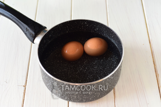 Для начинки отварим яйца вкрутую - это примерно 10-12 минут с момента начала кипения жидкости.