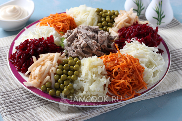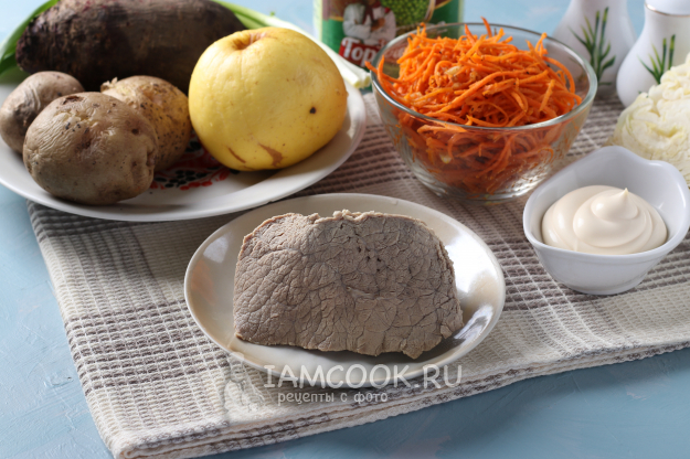 Для приготовления салата Ералаш с корейской морковью и говядиной подготовить из списка необходимые ингредиенты. Мясо, свеклу и картофель рекомендую сварить заранее.