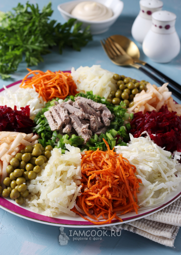 Оставшуюся часть зелёного лука посыпать вокруг мяса. Салат посолить и поперчить по вкусу. Подать салат Ералаш с корейской морковью на стол вместе с пиалой майонеза.