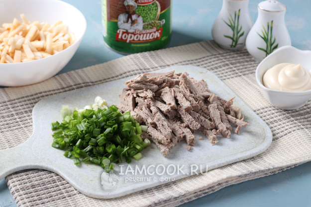 Нарезать соломкой говядину, измельчить зелёный лук.