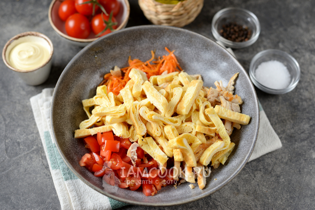 Нарежьте яичные блинчики и куриную грудку, переложите в миску.
