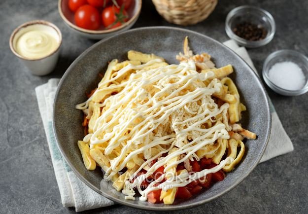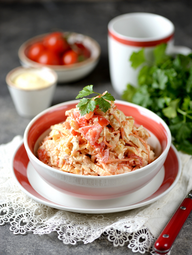 Натрите плавленый сырок на крупной терке, добавьте к остальным ингредиентам. Посолите и поперчите салат, заправьте майонезом хорошего качества, тщательно все перемешайте. Дайте салату пару минут постоять перед подачей, помидоры пустят немного сока и сделают его сочнее.