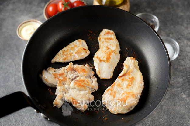 Куриное филе нарежьте тонкими ломтями, слегка отбейте, выложите в ту же сковороду и быстро обжарьте на сильном огне до румяной корочки - минуты по 3 с каждой стороны. Готовое филе также остудите.