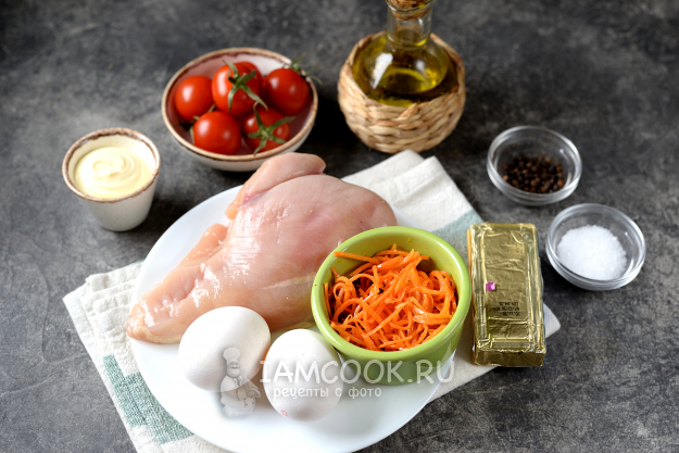 Возьмите все необходимые продукты для приготовления салата «Обжорка» с яичными блинчиками и курицей. Куриную грудку и помидоры помойте, обсушите. Помидоры я использую черри, они очень ароматные и сладкие, вы можете взять абсолютно любой сорт, который чаще всего покупаете.