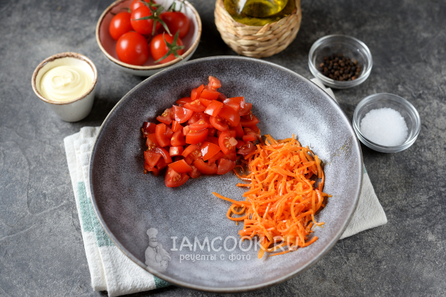 Помидоры нарежьте мелким кубиком, так же нужно измельчить морковь, чтобы в готовом салате ее было удобнее кушать. Сложите все в глубокую миску.
