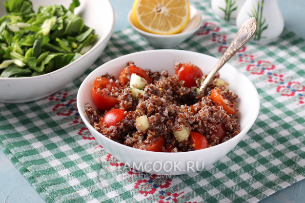К огурцам и помидорам добавить остывшую киноа и соус, всё хорошо перемешать.