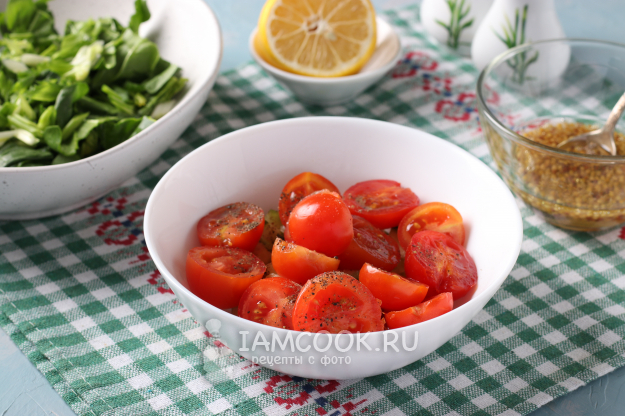 Тщательно вымыть шпинат, обсушить и порвать руками в миску. Вымыть помидоры черри и огурец. Огурец нарезать кубиком, а черри разрезать пополам, поперчить. Смешать в пиале все компоненты соуса.