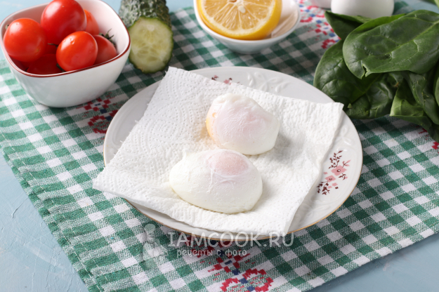 Сварить яйца пашот, выложить их на салфетку для удаления лишней влаги. Существует несколько разных способов приготовления пашот. Я варю 3-4 минуты по этому рецепту.
