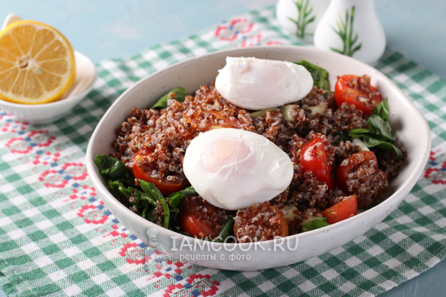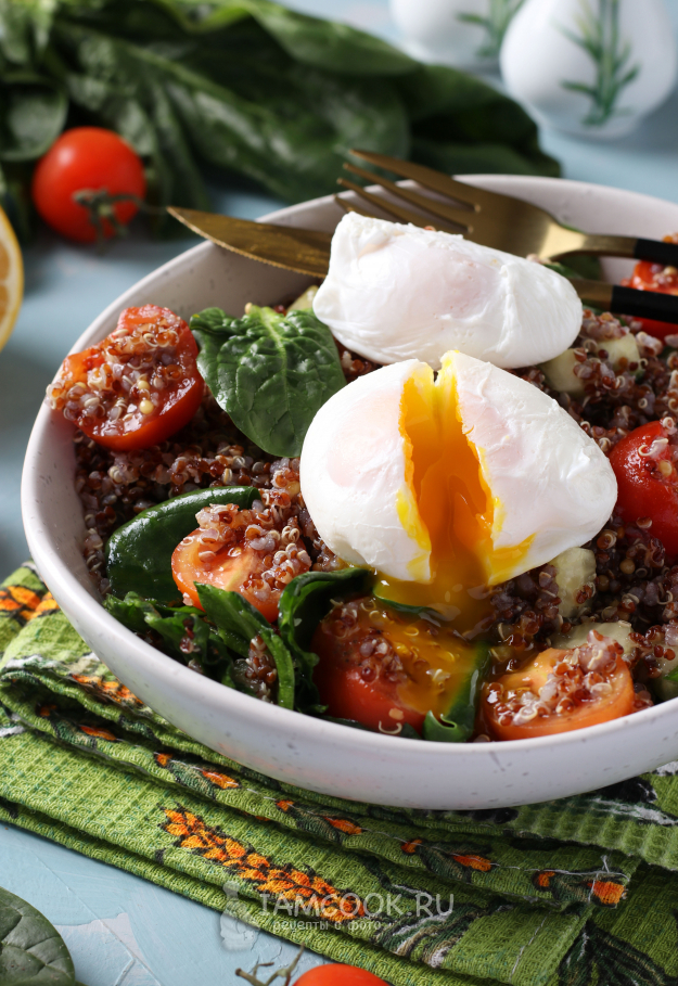 Вкусный и питательный салат с киноа и яйцом пашот подать к столу.