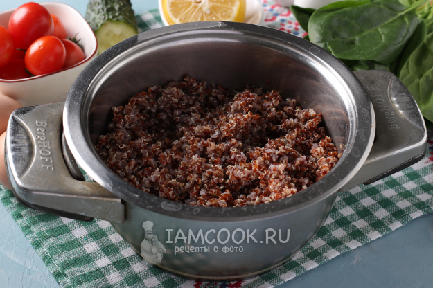 Крупу киноа промыть, аккуратно слить грязную воду. Залить в кастрюлю нужное количество воды в пропорции 2:1, дать закипеть и всыпать киноа, воду посолить. Варить до готовности 20-25 минут, пока крупа не впитает всю воду. В готовую крупу добавить столовую ложку оливкового масла и перемешать. Оставить остывать.