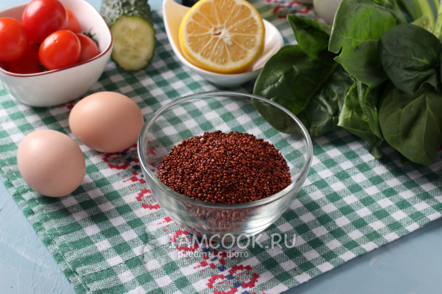 Возьмите ингредиенты для салата с киноа и яйцом пашот.