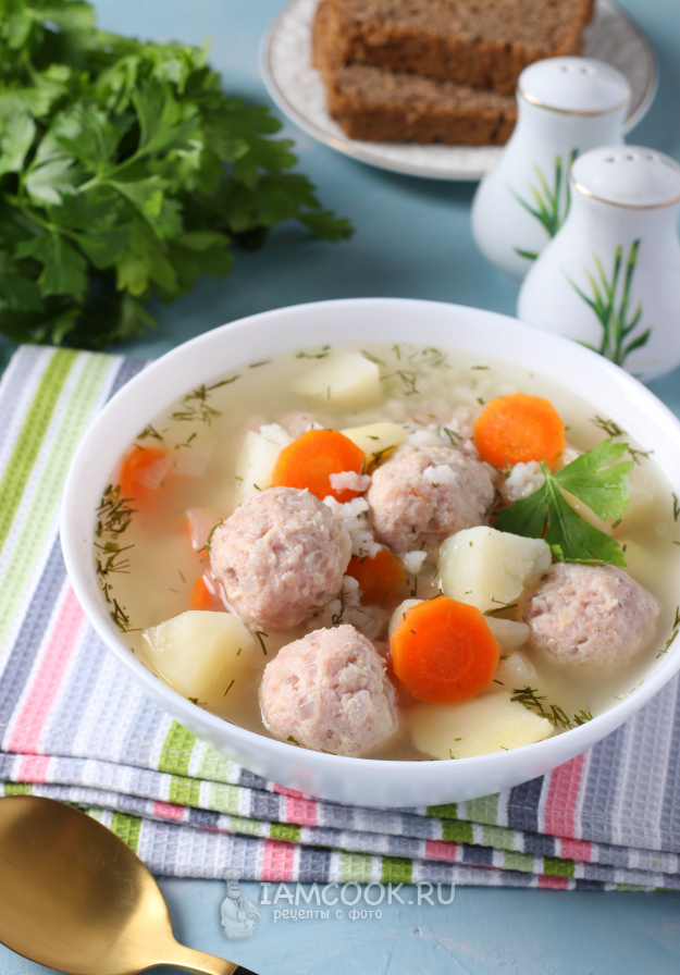 Для приготовления супа с куриными фрикадельками и рисом подготовить из списка необходимые ингредиенты.