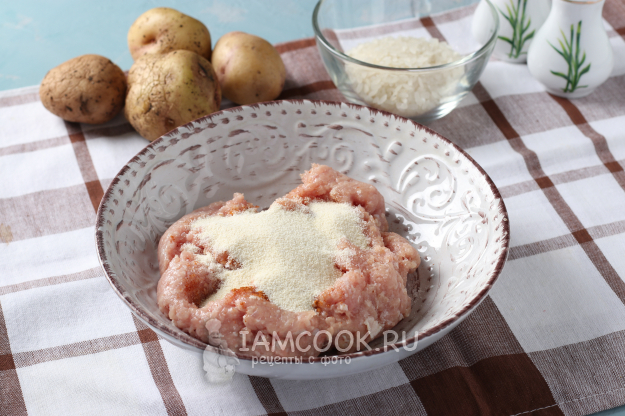 Куриный фарш поместить в тарелку, посолить и поперчить, добавить манную крупу и перемешать.