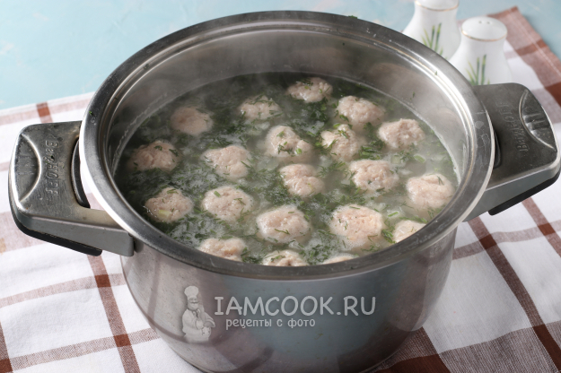 Затем опустить в бульон фрикадельки. Варить всё вместе 15-20 минут.
