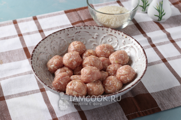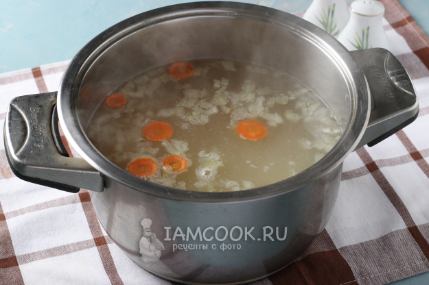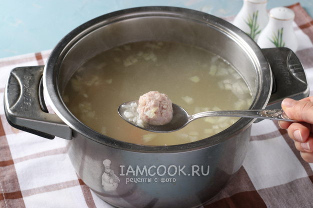 Овощной бульон или воду довести до кипения, добавить лук с морковью и варить 10 минут. Из фарша сформировать фрикадельки.